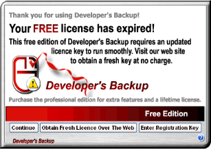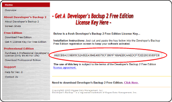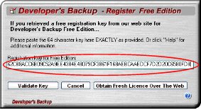 Step 2:  Cut and paste the 64 character free license key from the web page into the Developer's Backup registration screen. To get your free license key click Here.